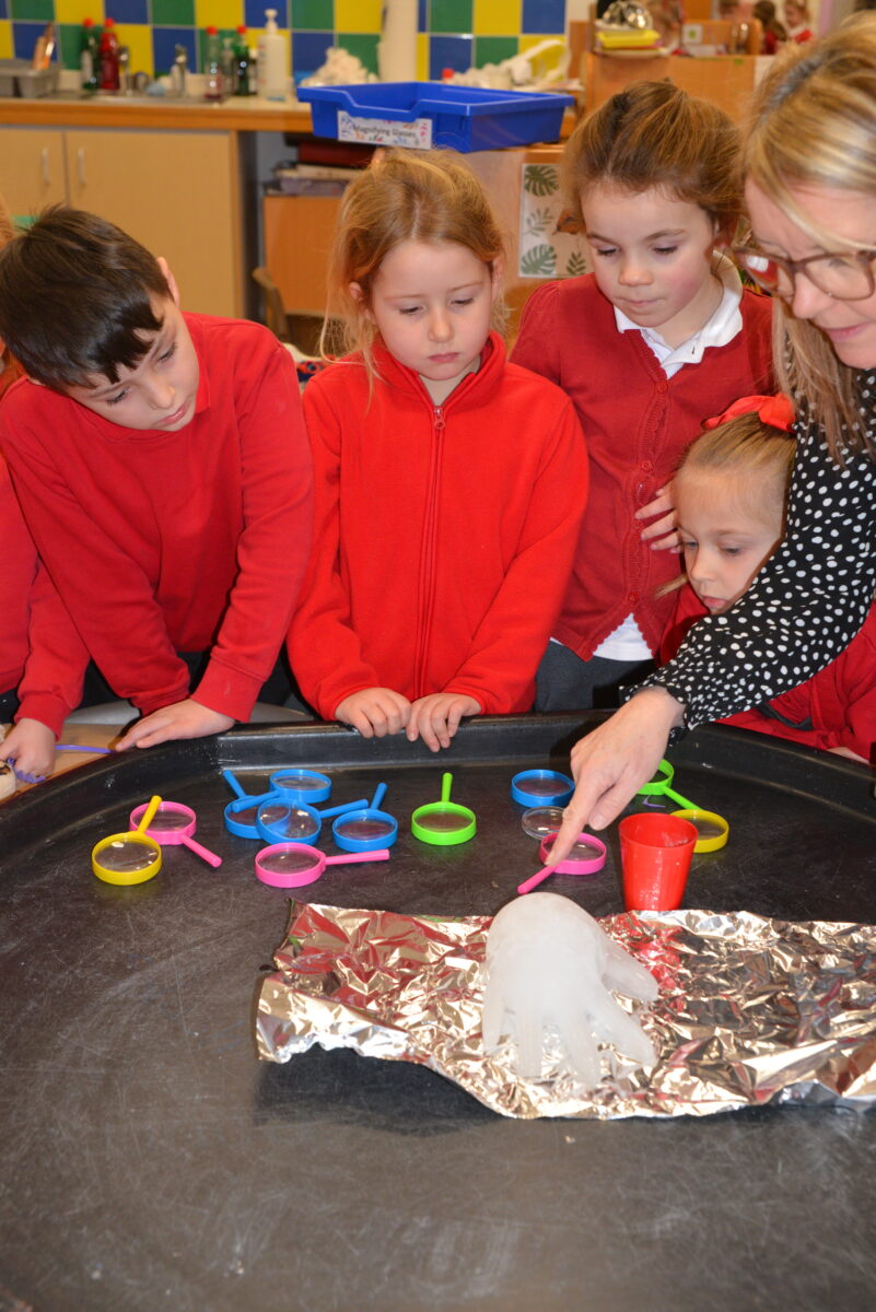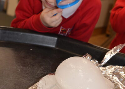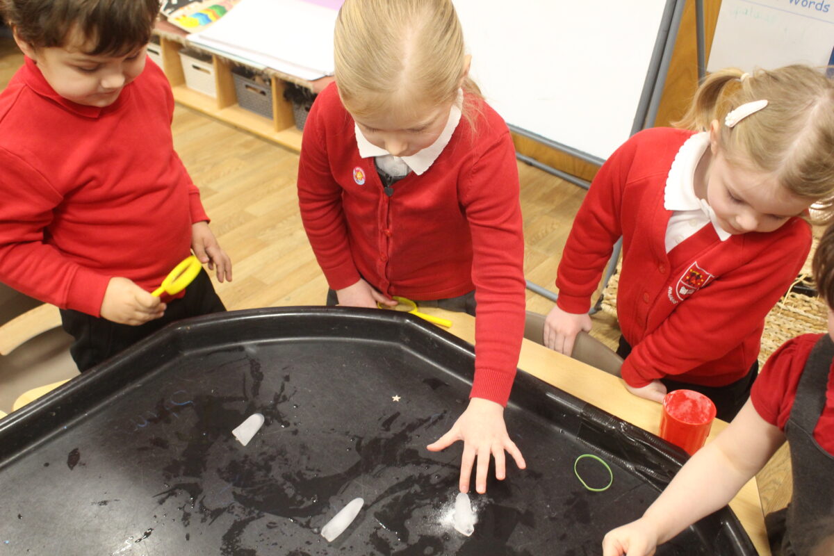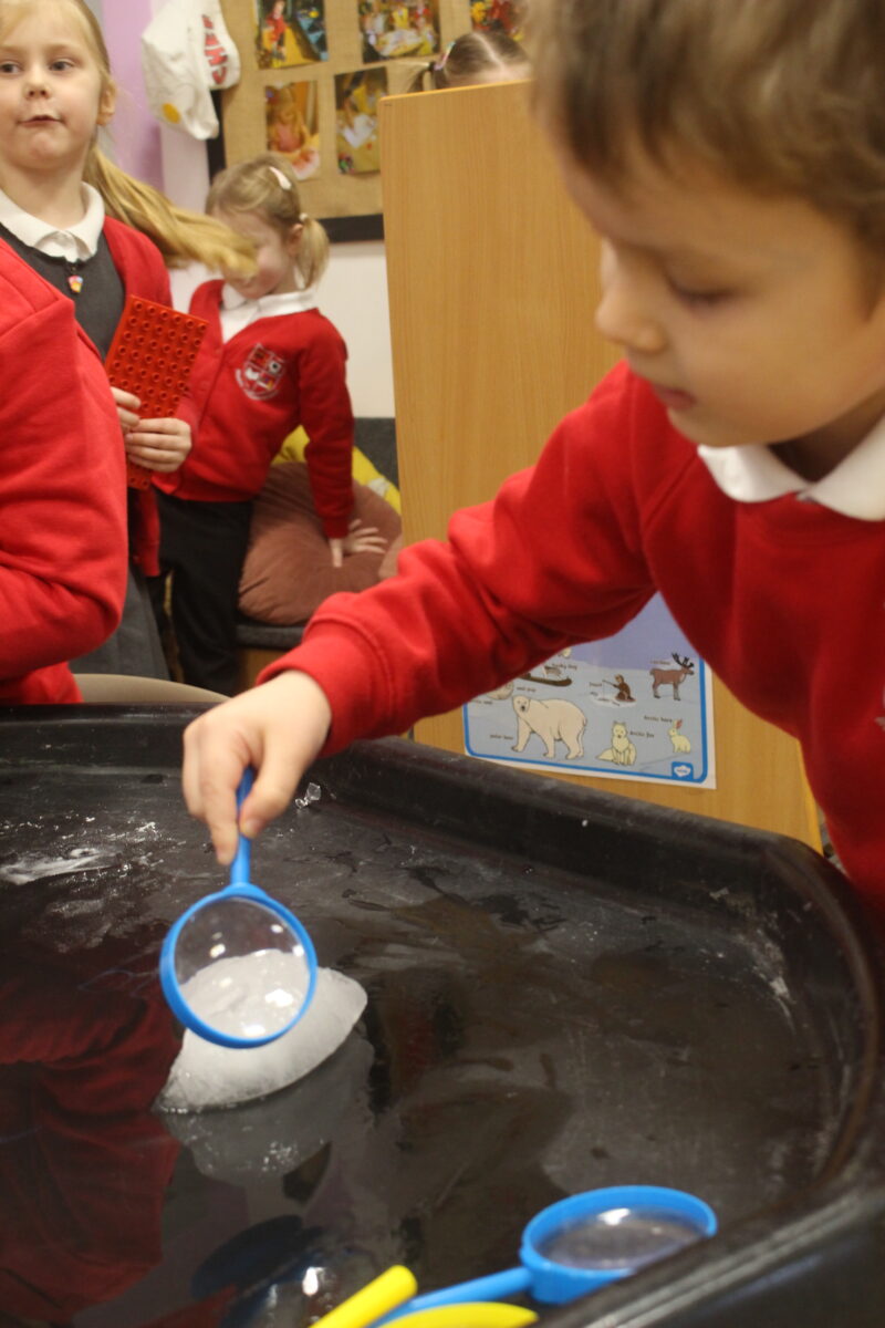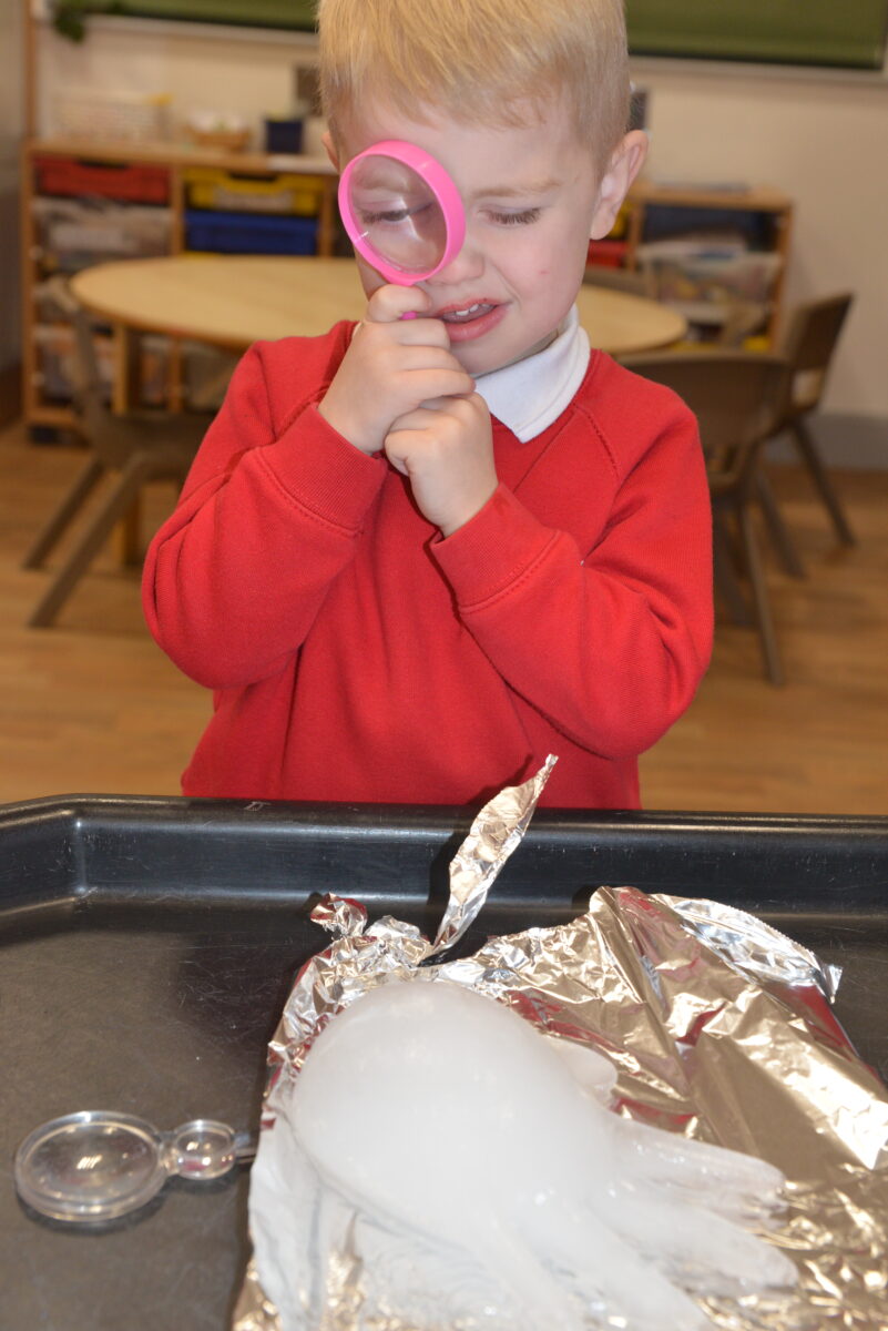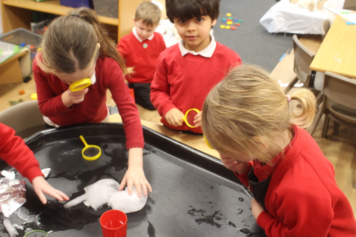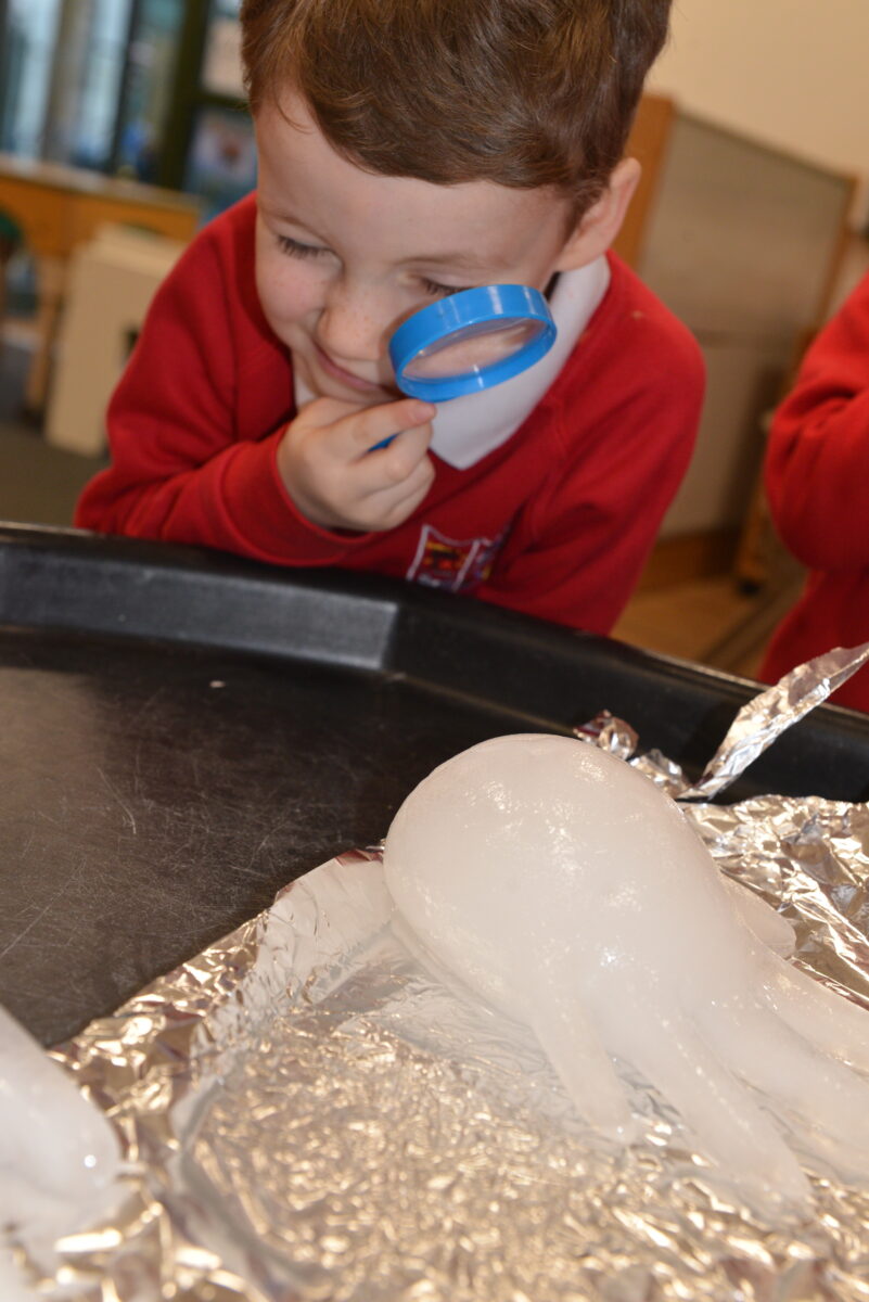 EYFS thoroughly enjoyed their science experiment exploring what would melt ice the fastest. They tested salt, their hands, tin foil, warm water, and simply leaving the ice at room temperature. The children predicted that salt would work the quickest, linking it to how salt is used on roads when it snows. Warm water turned out to be the fastest, closely followed by salt. The children had lots of fun experimenting, making predictions, and talking about their results.