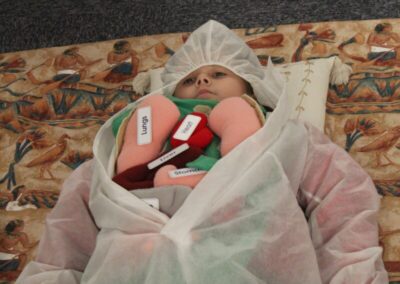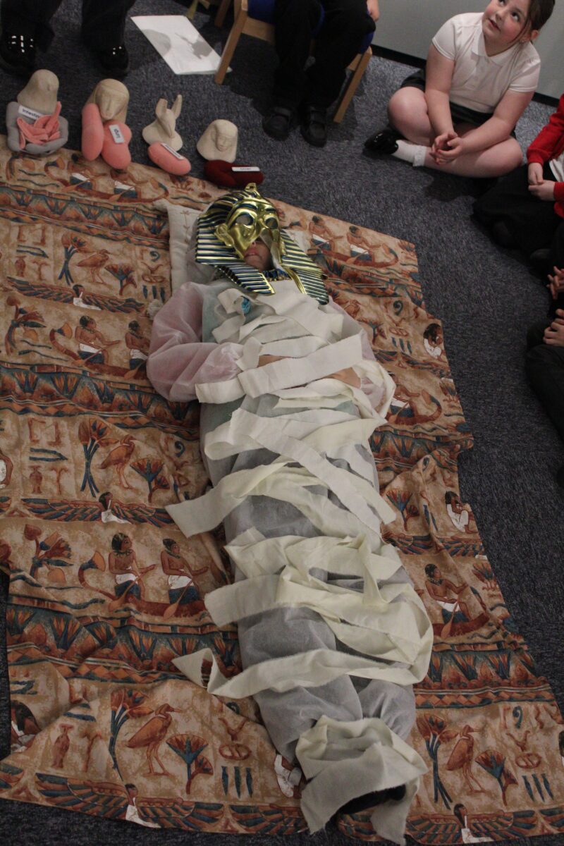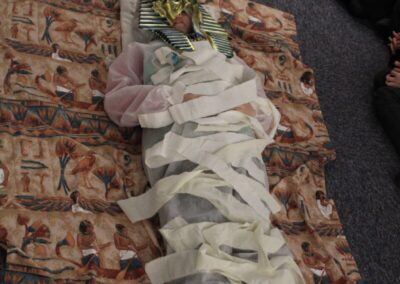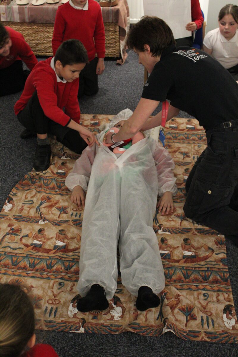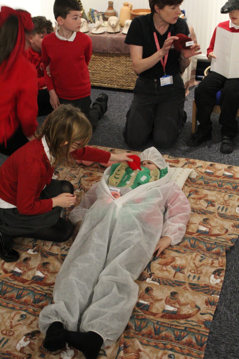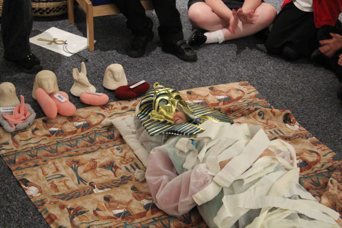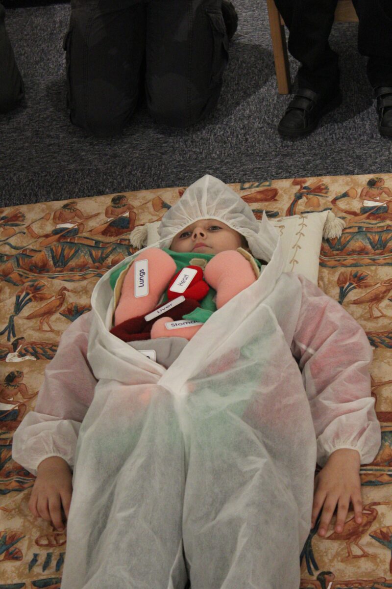 At the Hands on History museum, we experienced the wonders of the artefacts that the archaeologist, Howard Carter, and his team saw when they discovered the tomb of Tutankhamun, handled real and replica Egyptian artefacts and learnt about the real mummy displayed in the museum.  After we had great fun mummifying one of our friends and learning about mummification with the museum staff.