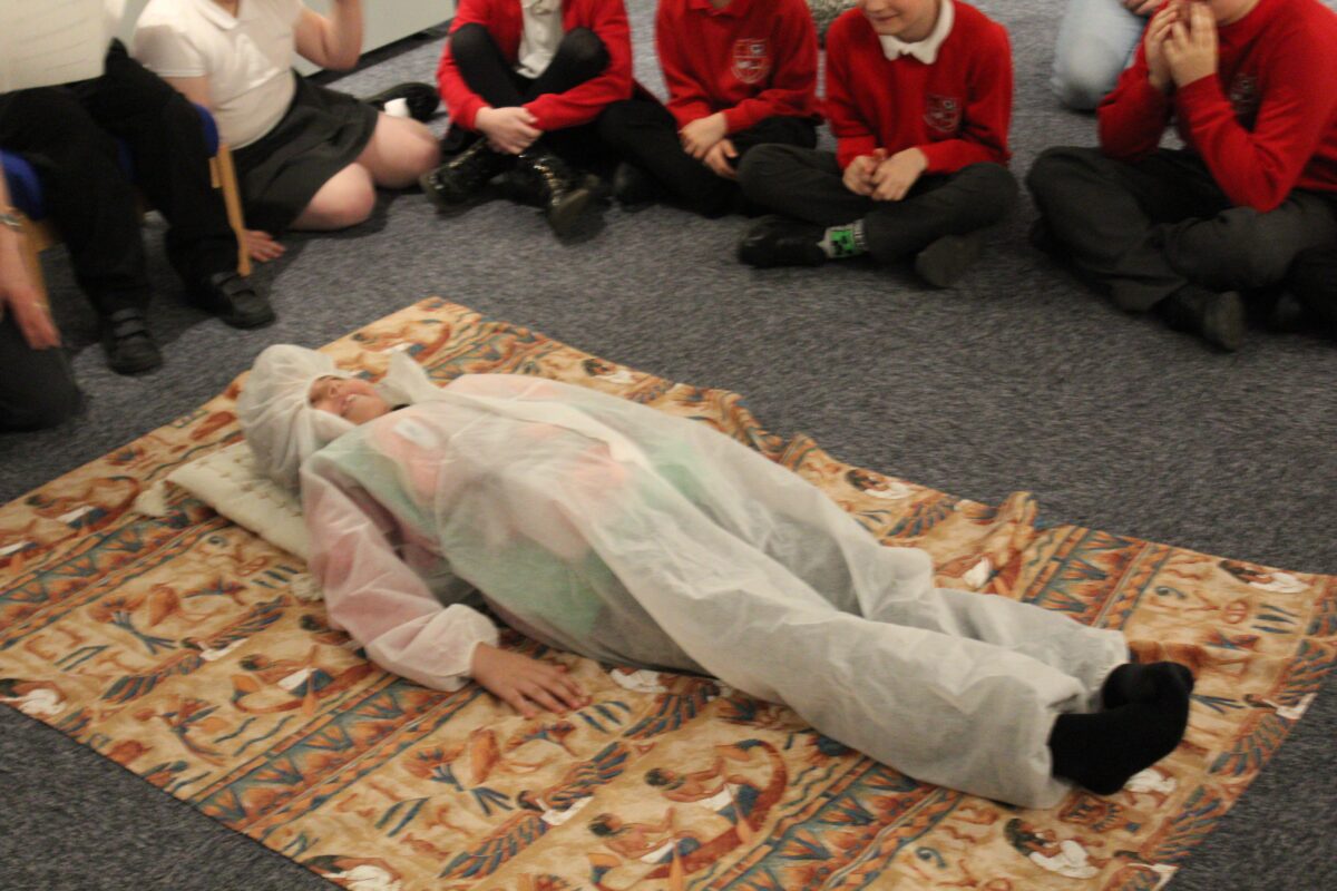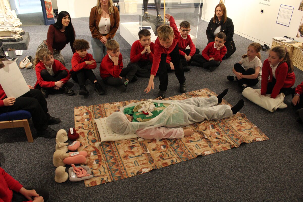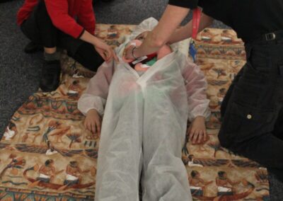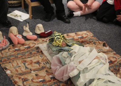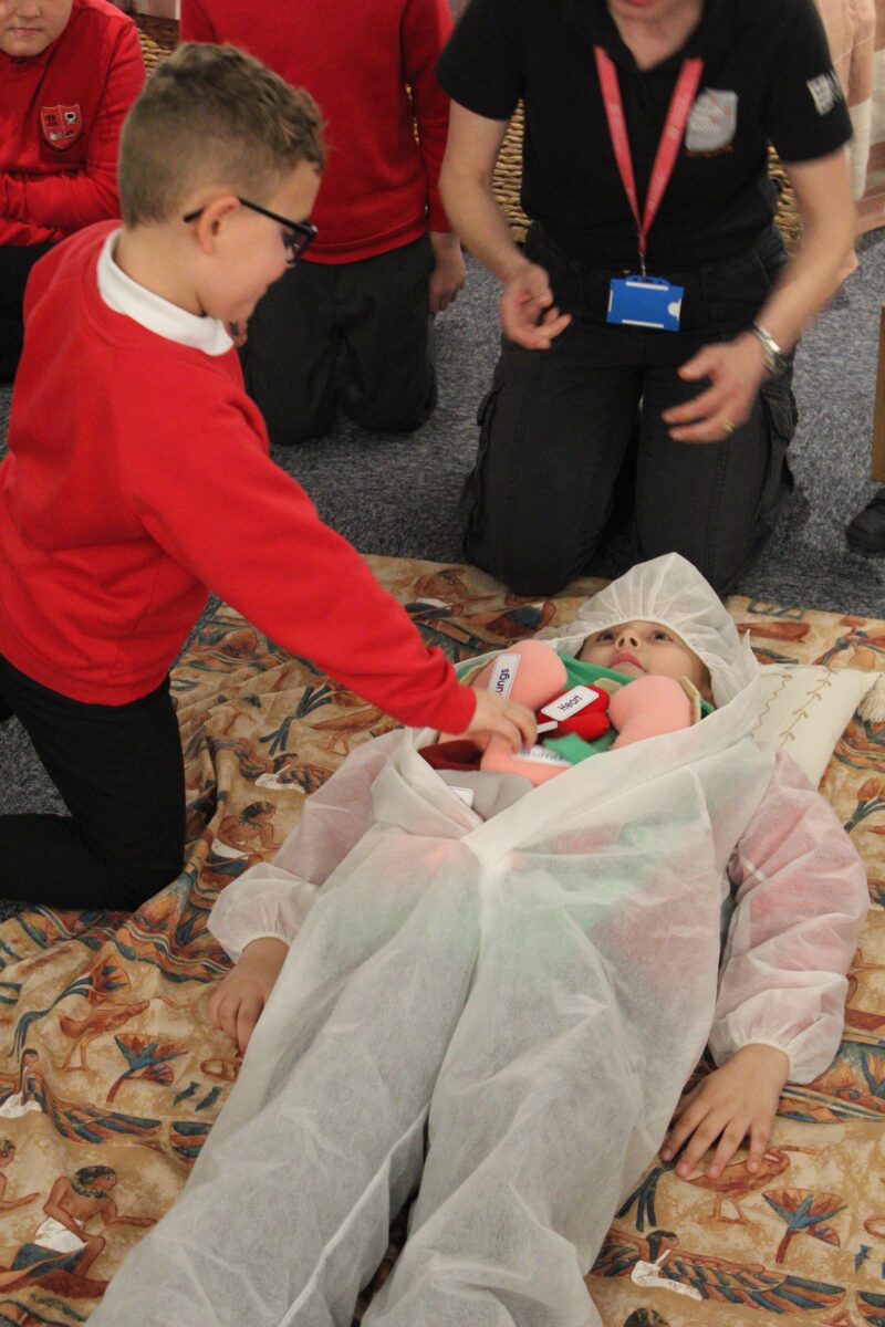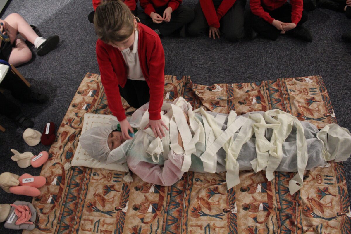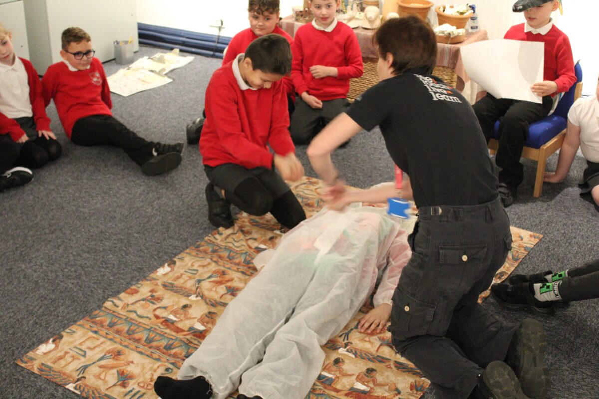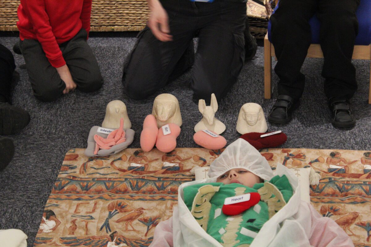 At the Hands on History museum, we experienced the wonders of the artefacts that the archaeologist, Howard Carter, and his team saw when they discovered the tomb of Tutankhamun, handled real and replica Egyptian artefacts and learnt about the real mummy displayed in the museum.  After we had great fun mummifying one of our friends and learning about mummification with the museum staff.