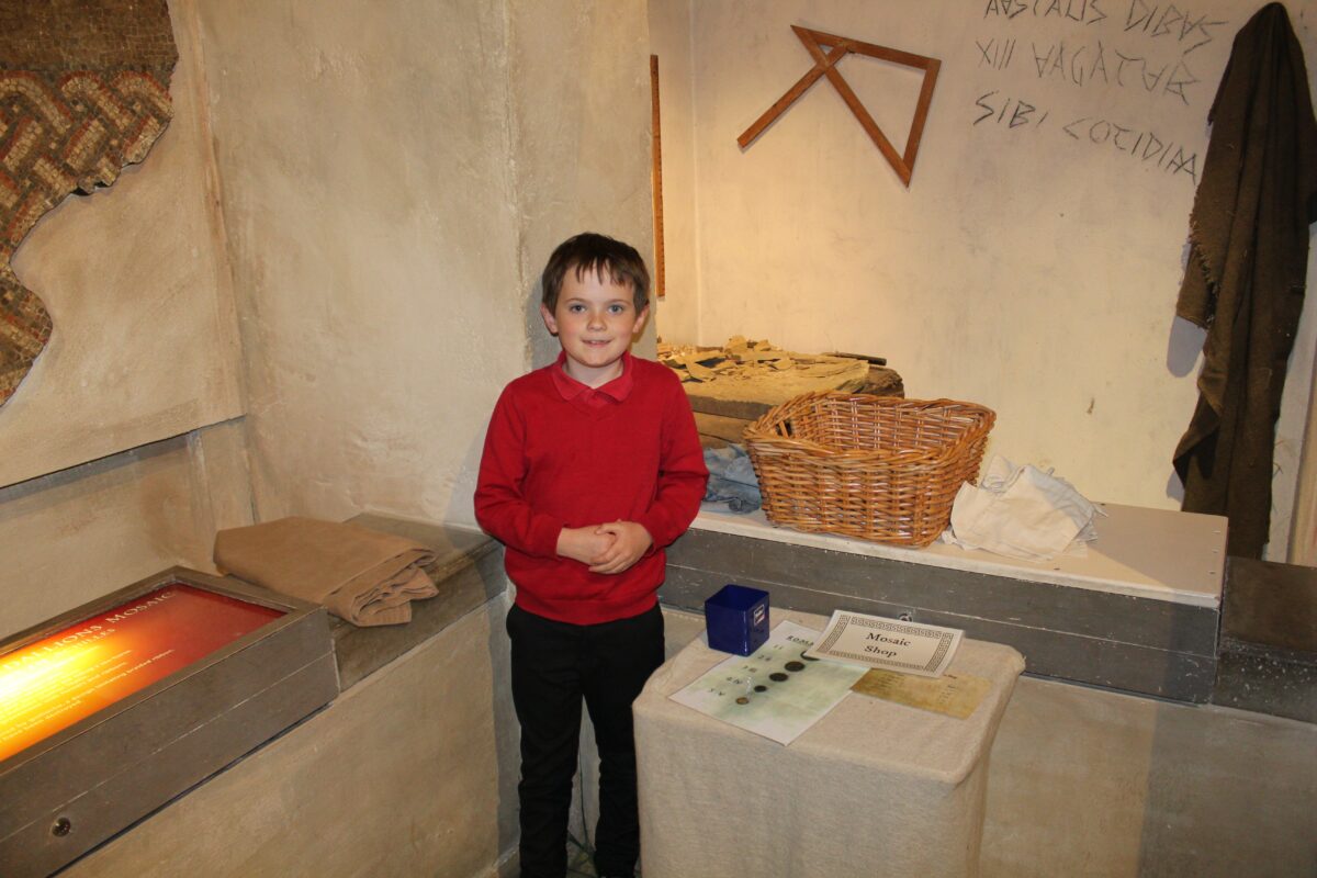 Alongside the museum staff, we had the chance to handle, learn about and discuss real ancient Roman and replica artefacts and try on some soldier clothing and hold a shield (it was super heavy!!!).  For the budding future architects, artists and engineers among us we also built some arches which was quite tricky and made mosaics from real tile pieces (tessera).   After a tour of the other huge mosaics and other Roman artefacts and displays in the museum, we headed off to the agora (market place).  There we transformed into Roman shopkeepers and shoppers and did some shopping while trying to avoid the tax collector – that was really fun!